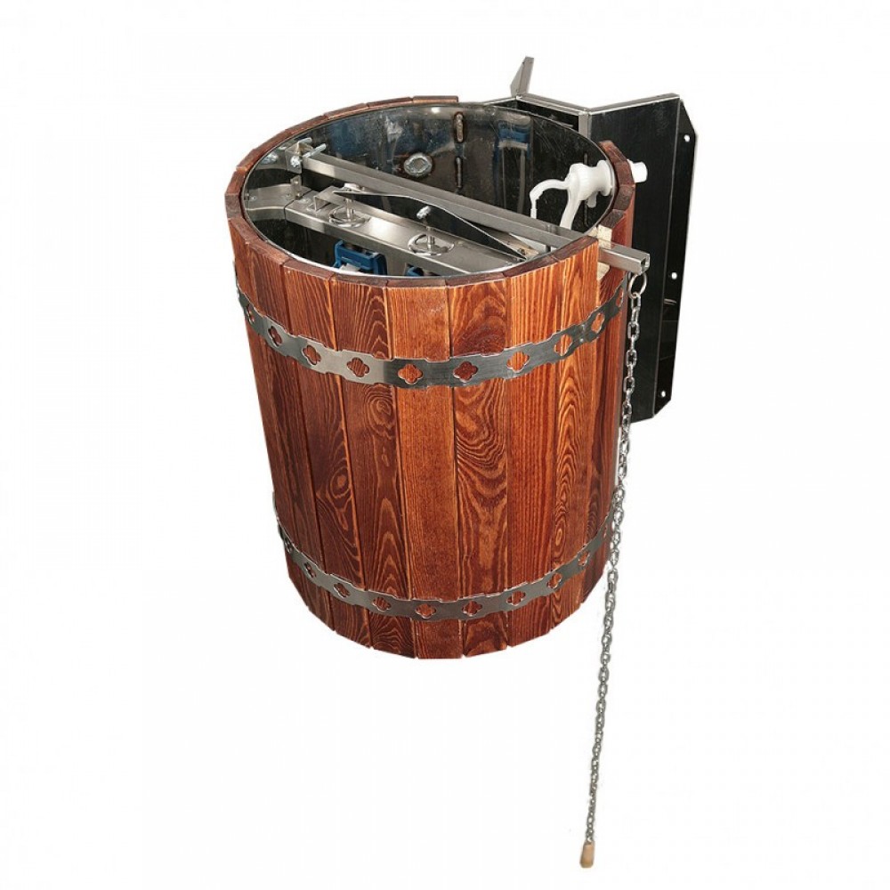 У обычных обливных ведер объем воды составляет 10-20 литров, что явно недостаточно для эффективного и единовременного охлаждения тела. В результате возникает дисбаланс между разогретыми и охлажденными его участками. В обливном устройстве «Ливень» запас воды составляет 50 литров, что эффективно позволяет охладить тело после самого интенсивного парения. Специальный рассекатель формирует поток изливающейся воды таким образом, чтобы полностью охватить тело человека и охладить его.
