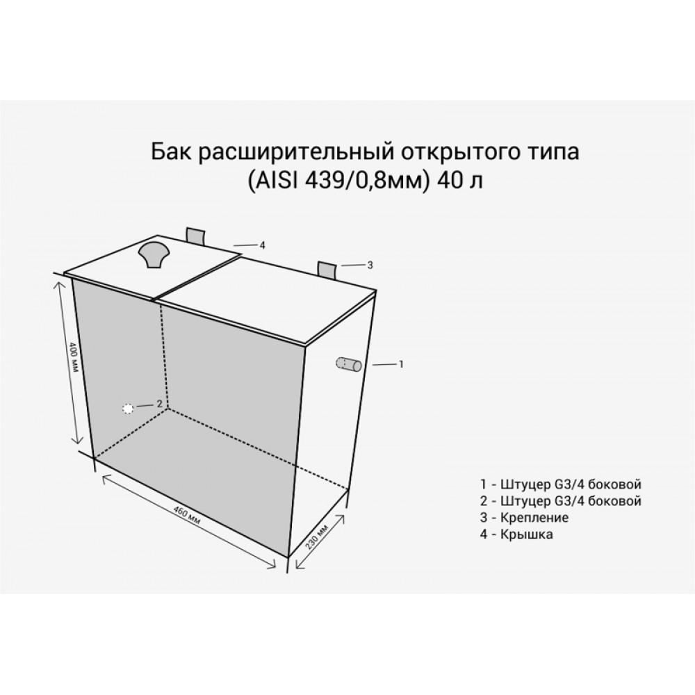 Бак расширительный открытого типа (AISI 439/0,8мм) 40л для самотечной системы отопления, предназначен для компенсации изменения объема теплоносителя при его расширении в результате нагрева. Расширительный бак устанавливается в наивысшей точке отопительной системы.