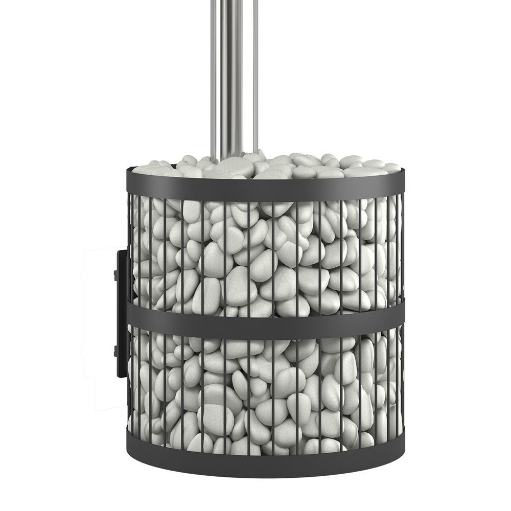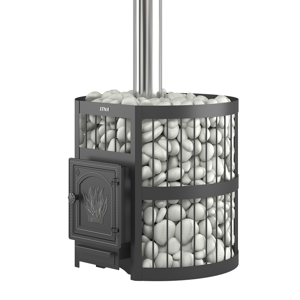Для устройства наружной открытой каменки печь ЭТНА 24 оснащается металлическим кожухом с прорезным рисунком оригинального дизайна. Пространство между печью и кожухом из двухмиллиметровой стали заполняется камнями для бани, которые выполняют роль теплонакопителя, перераспределяют тепло от стенок топки и защищают парящихся от жёсткого инфракрасного излучения. Воду подают на нагретые камни, с которых полученный пар распространяется по всему объёму парной. Кожух диаметром 560 миллиметров вмещает в себя до 110 килограммов камней крупной и средней фракции.