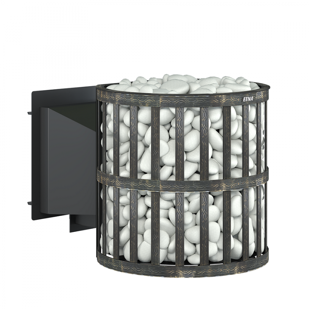 Для устройства наружной открытой каменки печь ЭТНА 24 Панорама М комплектуется сеткой из стальной ленты. Узор на наружной поверхности сетки патинирован термостойкой бронзовой краской. Пространство между печью и сеткой заполняется камнями для бани, которые выполняют роль теплонакопителя, перераспределяют тепло от стенок топки и защищают парящихся от жёсткого инфракрасного излучения. Воду подают на нагретые камни, с которых полученный пар распространяется по всему объёму парной.