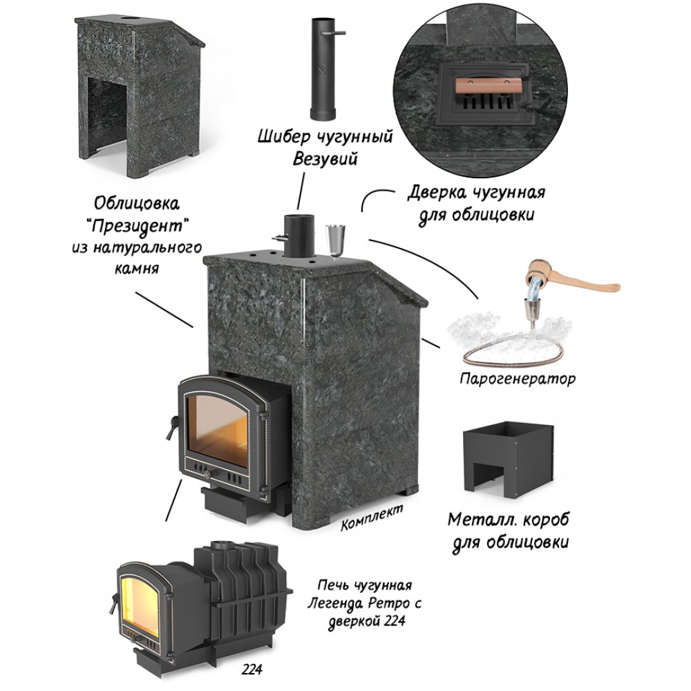 Заказать и приобрести Комплект Президент «Легенда Ретро 224» Талькохлорит, S-40 производителя ПТК "Везувий" можно в нашем специализированном интернет-магазине Pechkoff.by. Наша компания осуществляет доставку по всем регионам и городам Республики Беларусь.