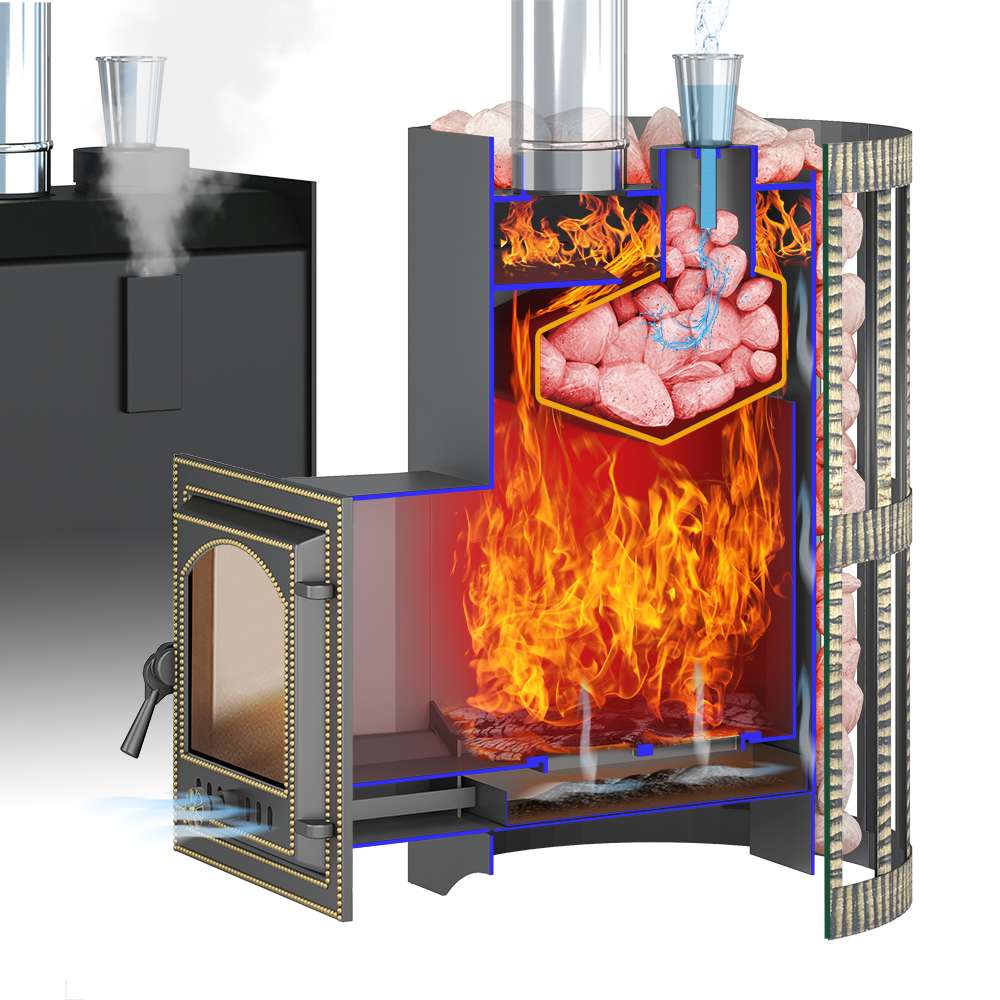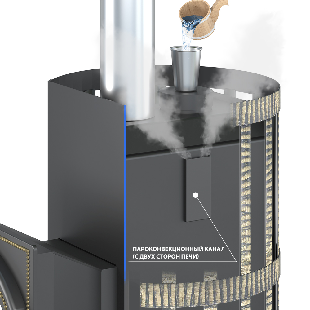 Получившийся мелкодисперсный пар выходит через пароконвекторные каналы на боковых поверхностях топки. Выйдя через щелевые отверстия, пар по П-образному профилю направляется вверх, на камни открытой каменки.