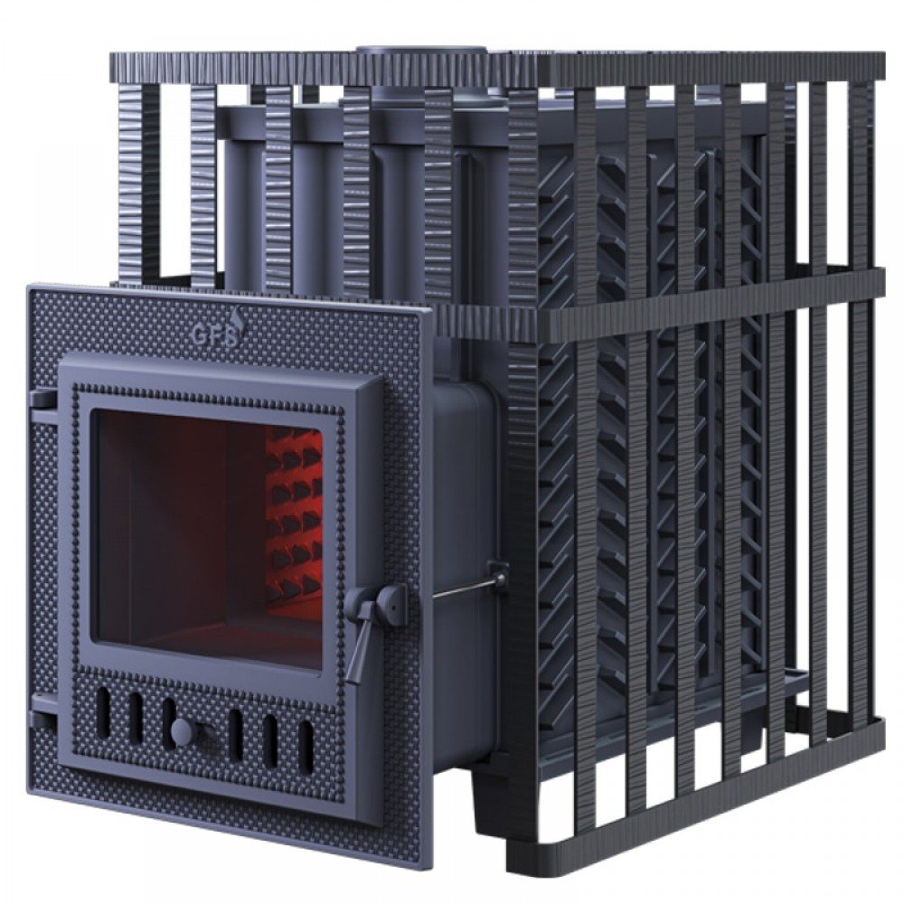 Банная печь GFS ЗК 18 (М) в сетке с усиленной каменкой большей массы, с единым углублением внутрь топки для дополнительной укладки чугунного заряда. Теплосъемные шипы, со стороны горения пламени, в разы увеличивают площадь соприкосновения огня с каменкой и ускоряют передачу тепла, а также способствуют лучшему дожигу смешивая потоки пламени и воздуха поступаемого из воздушника. Эти усовершенствования значительно повышают мощность парообразования печи и выдают большее количество пара при непрерывной подаче воды.