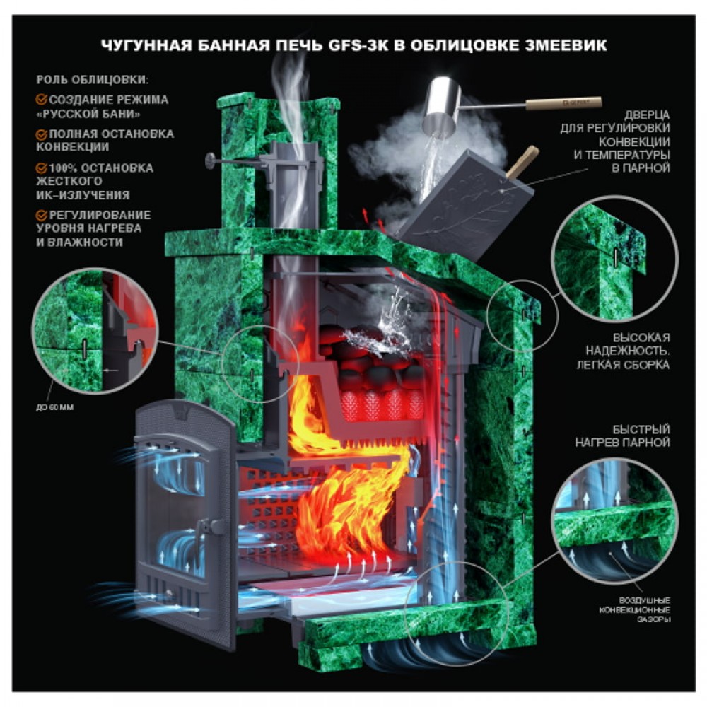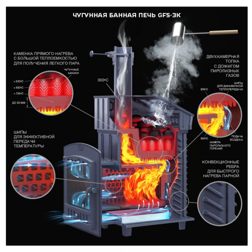 Банная печь GFS ЗК 18 (П) в сетке с усиленной каменкой большей массы, с единым углублением внутрь топки для дополнительной укладки чугунного заряда. Теплосъемные шипы, со стороны горения пламени, в разы увеличивают площадь соприкосновения огня с каменкой и ускоряют передачу тепла, а также способствуют лучшему дожигу смешивая потоки пламени и воздуха поступаемого из воздушника. Эти усовершенствования значительно повышают мощность парообразования печи и выдают большее количество пара при непрерывной подаче воды.