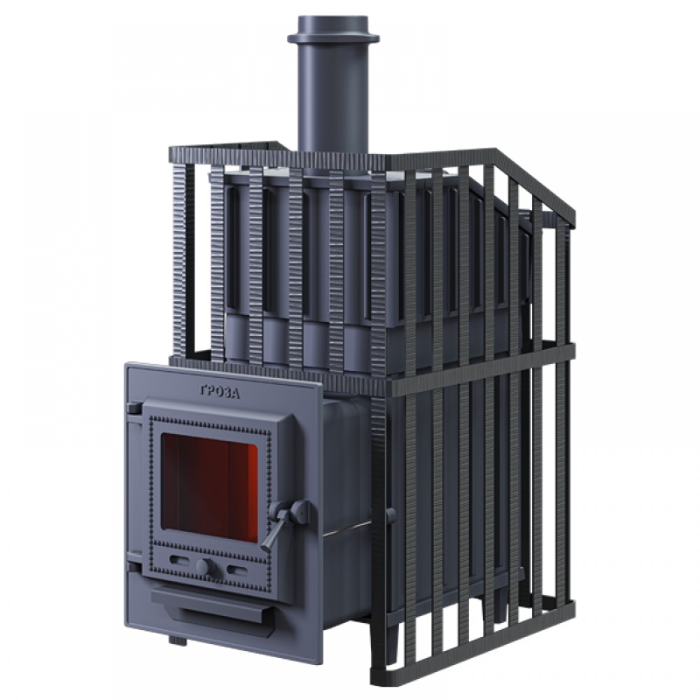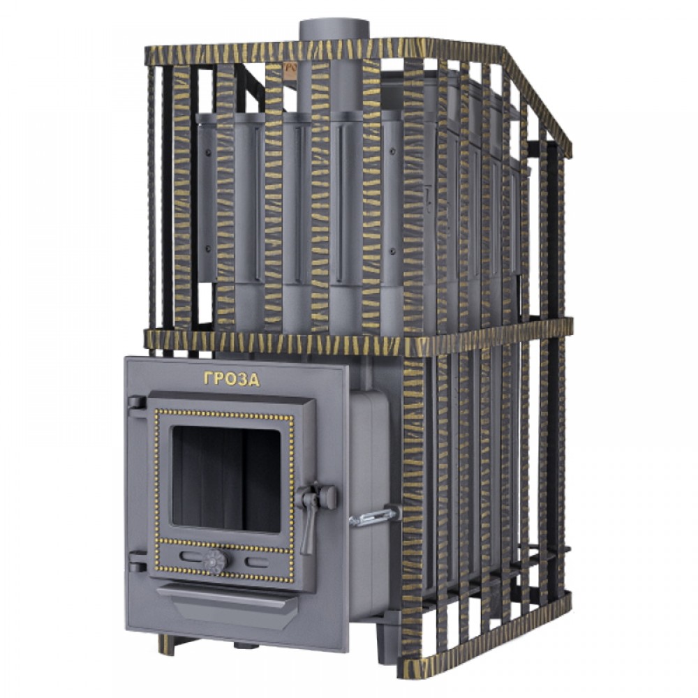 - Печь для бани Гроза Ураган - расширенный комплект печи в сетке. Максимально приближенный вариант печи для режимов русской парной, имеющий непосредственно закрытую чугунным коробом каменку, дверцу для пара с ручкой из бука, увеличенную до 50 см чугунную стартовую трубу.