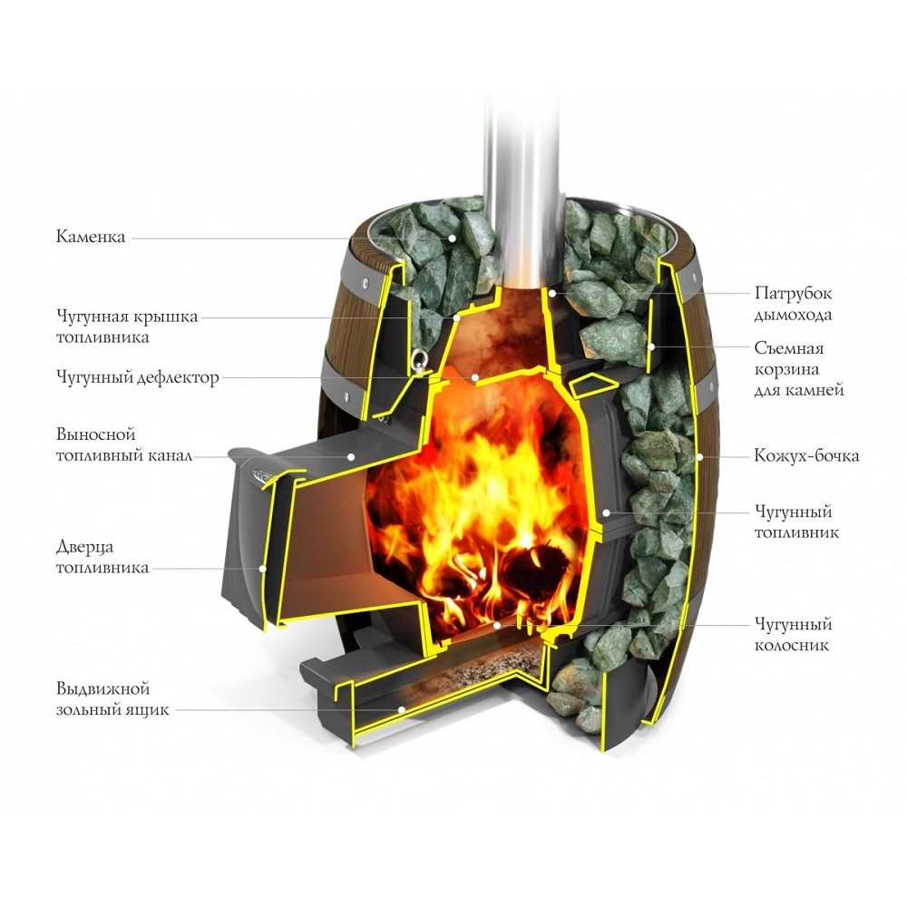 Топливный канал печи, при правильном ее размещении в бане, практически незаметен из парной и не искажает восприятие печи как стоящего в углу парной деревянного бочонка.