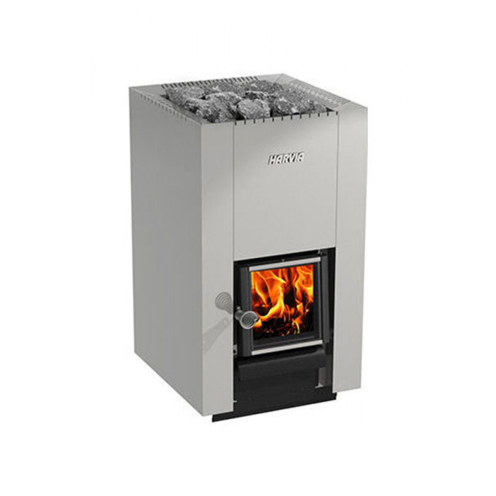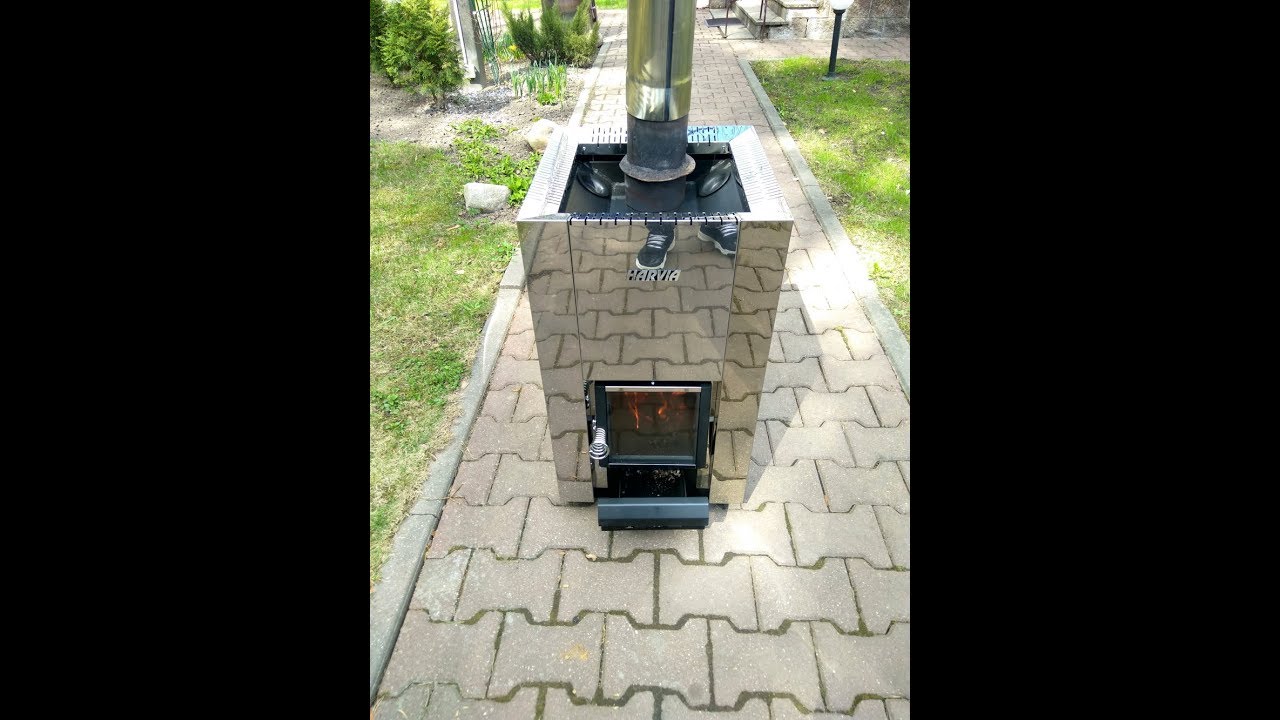 Первая протопка стильной дровяной печи Harvia Steel перед установкой.