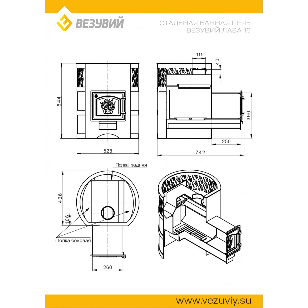 Стальная банная печь серии Лава усовершенствованной конструкции работает на дровах и предназначена для нагрева пространства парной и получения пара. Печь Везувий Лава 16 (ДТ-3С) рассчитана на объем парной 8-18 кубометров.