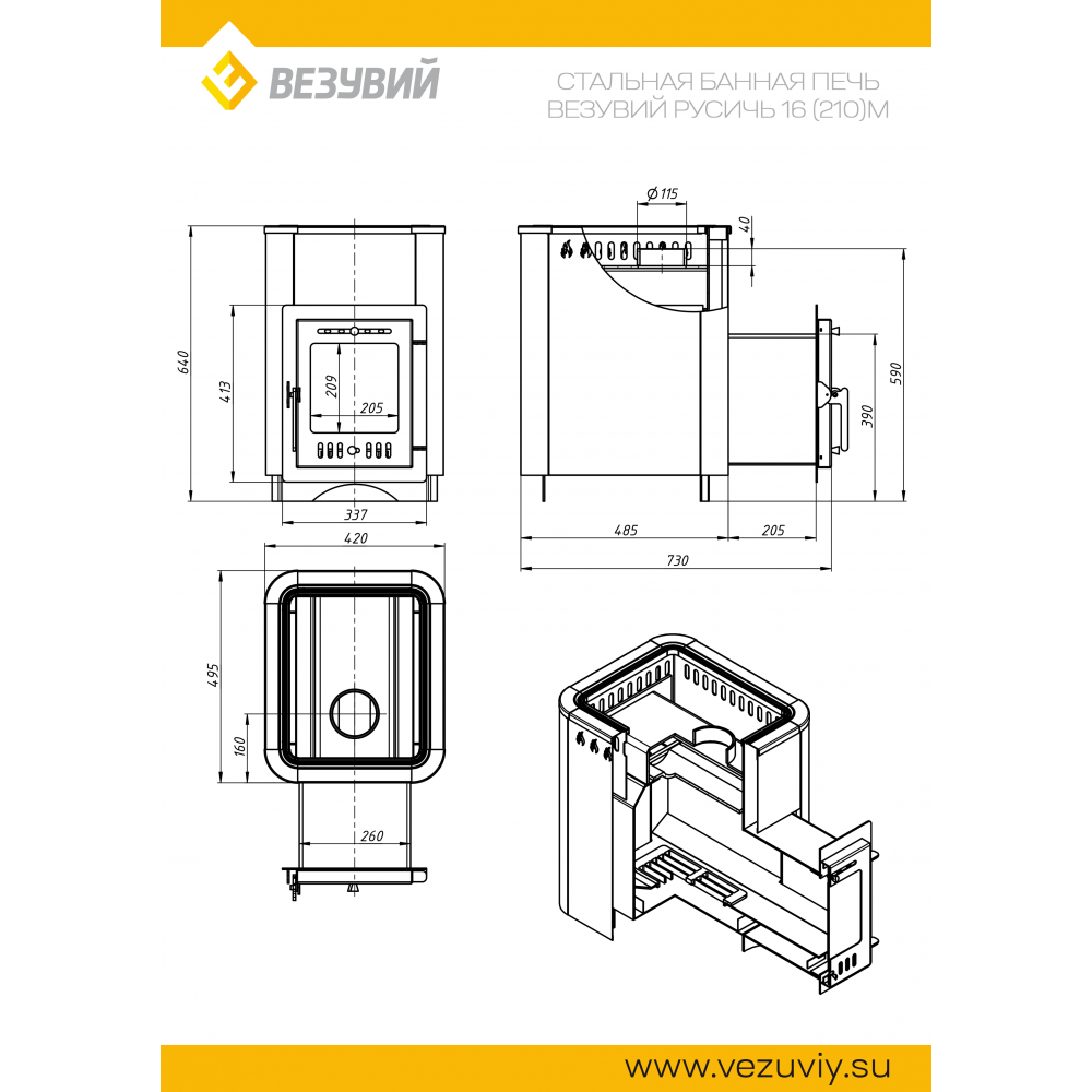 Конвекционная банная печь ВЕЗУВИЙ Русичъ Антрацит 16 (210) "М" 2022 изготовлена из особо прочной котловой стали марки 09Г2С толщиной 4-6 мм и может устанавливаться в парную объёмом от 8 до 18 кубических метров.