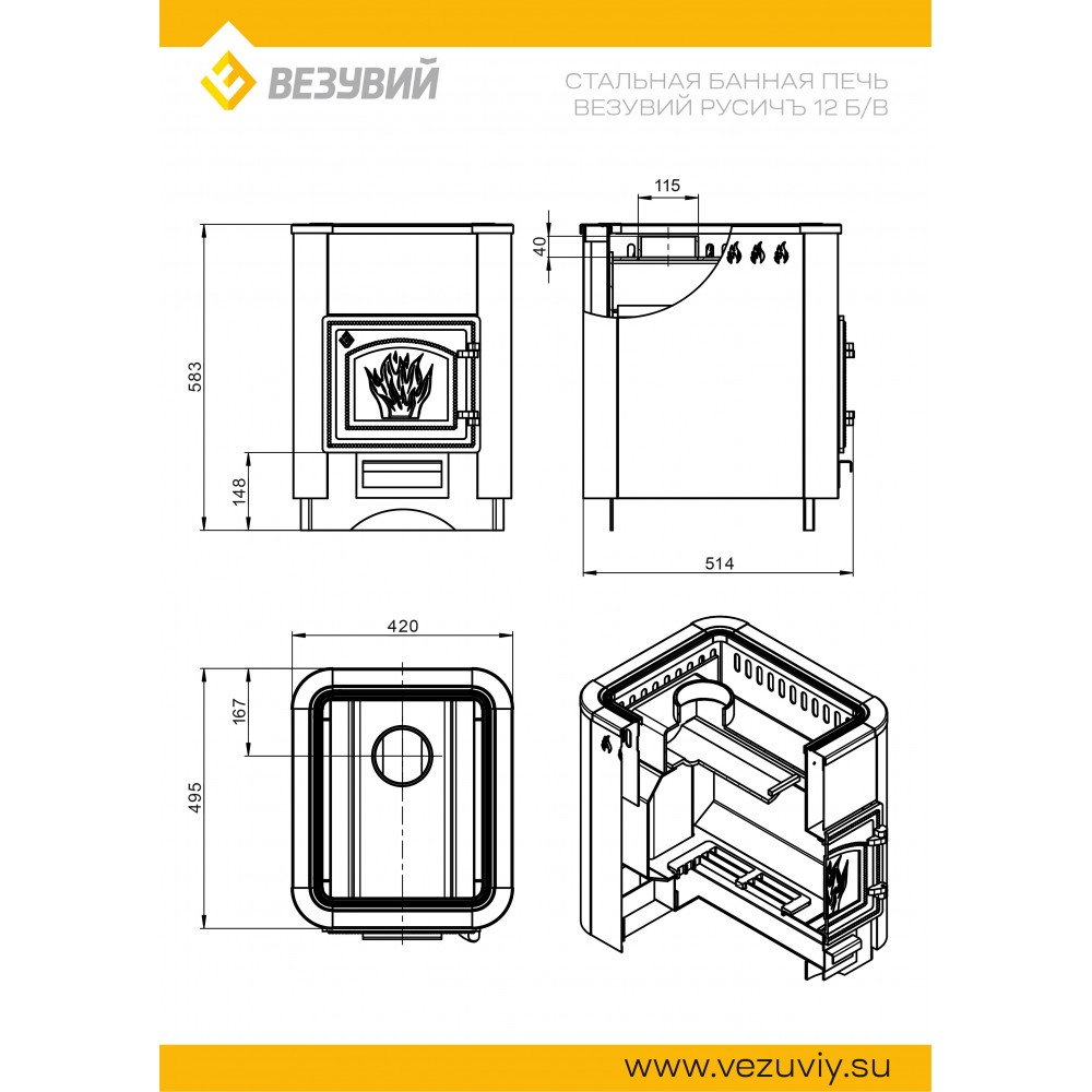 Конвекционная банная печь ВЕЗУВИЙ Русичъ Антрацит 12 (ДТ-3) б/в изготовлена из особо прочной котловой стали марки 09Г2С толщиной 4-6 мм и может устанавливаться в парную объёмом от 6 до 14 кубических метров.