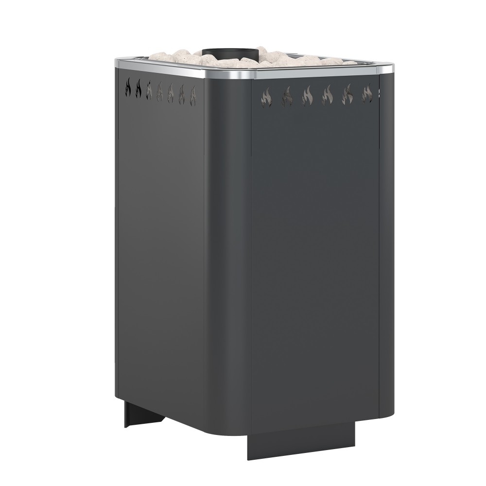 Стальной кожух печи зафиксирован на корпусе, для улучшения конвекции оснащён прорезными отверстиями в верхней части. Внутренние вырезы обеспечивают попадание холодного воздуха к камням, наружные – нагрев воздуха в парной.
