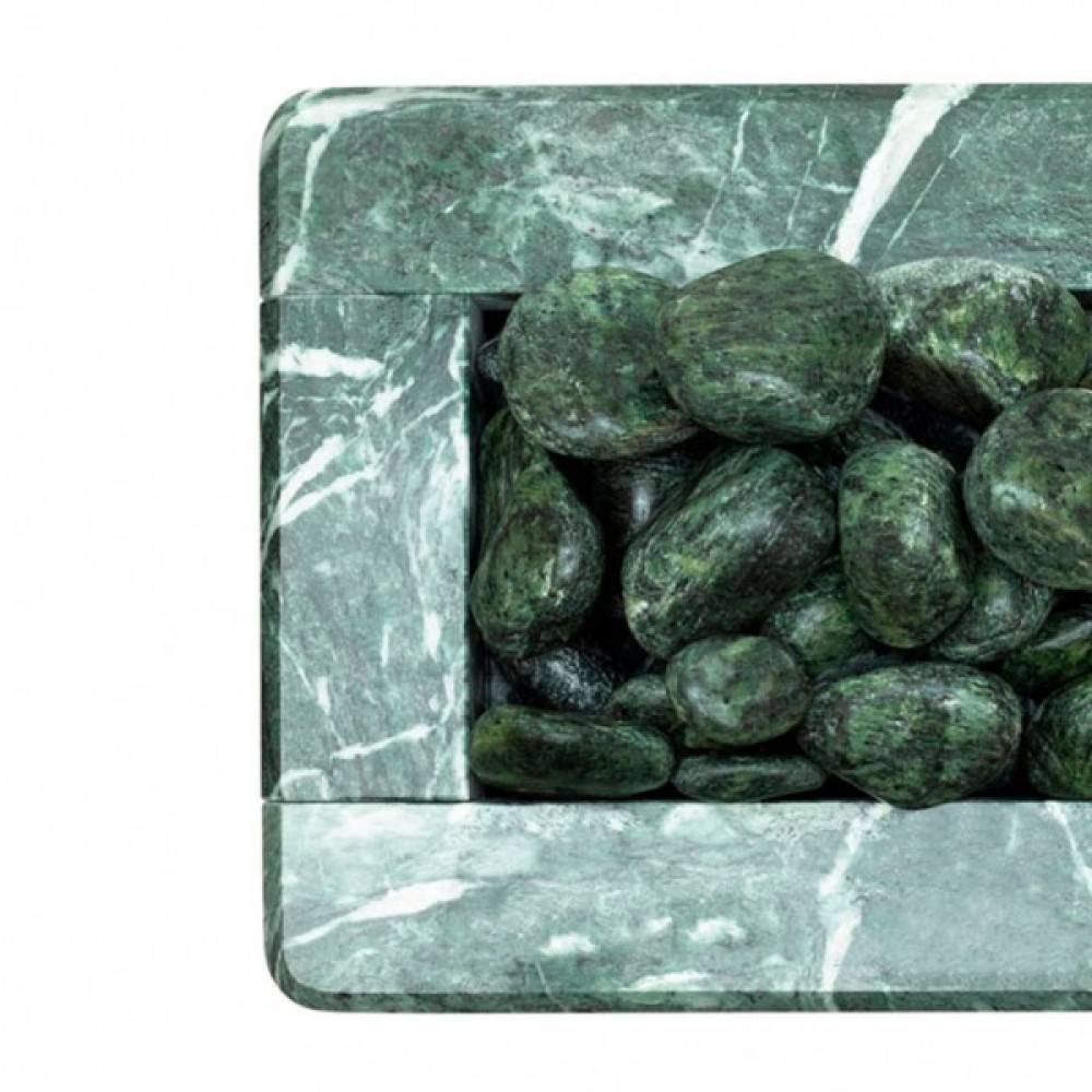 Печь с подобным дизайном стильно смотрится в парильном помещении. Змеевик уже долгие годы используется для внутренней отделки бань. Его называют «аптекарским камнем» за его целебные качества. Минерал оказывает обеззараживающий эффект, положительно влияет на кости, оказывает успокаивающее воздействие и укрепляет иммунитет.