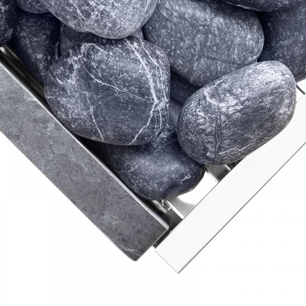 Благодаря своему стильному и лаконичному дизайну, электрокаменка впишется в сауны с различным интерьером. Простые формы каменки выгодно подчеркнуты 4 вертикальными камнями талькохлорита, которыми облицованы передняя и задняя стенки печи. Материал боковых стенок представляет собой высококачественная нержавеющая сталь, защищающая все внутренние элементы прибора от влаги, температурных перепадов и коррозии.