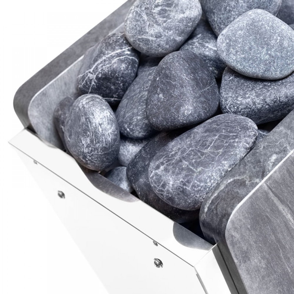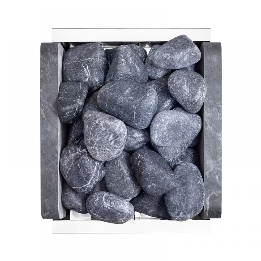 Электрокаменка данной модели компактна, а благодаря своему стильному и лаконичному дизайну, она впишется в сауны с различным интерьером. Простые формы каменки выгодно подчеркнуты 4 вертикальными камнями талькохлорита, которыми облицованы передняя и задняя стенки печи. Материал боковых стенок представляет собой высококачественная нержавеющая сталь, защищающая все внутренние элементы прибора от влаги, температурных перепадов и коррозии.