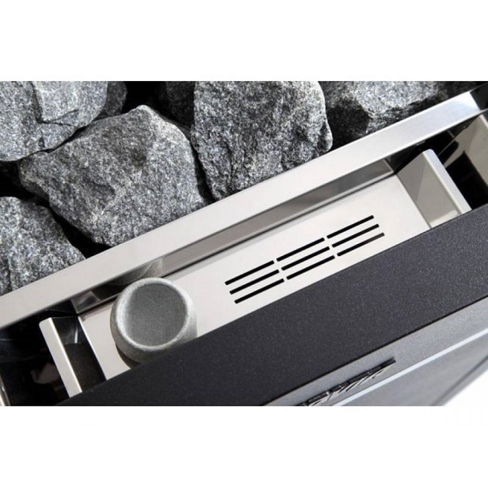 Каменка оснащена также чашей из мыльного камня для жидких ароматизаторов и решеткой из нержавеющей стали для ароматизаторов в пакетиках. Корпус печи выполнен из нержавеющей стали. Управляется каменка с помощью отдельного пульта HARVIA.