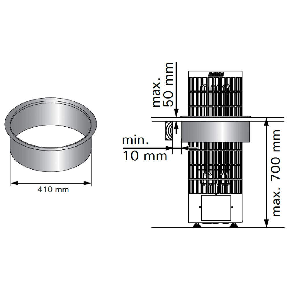 Монтажный фланец защищает деревянный полок от теплового излучения и придает конструкции законченный вид.