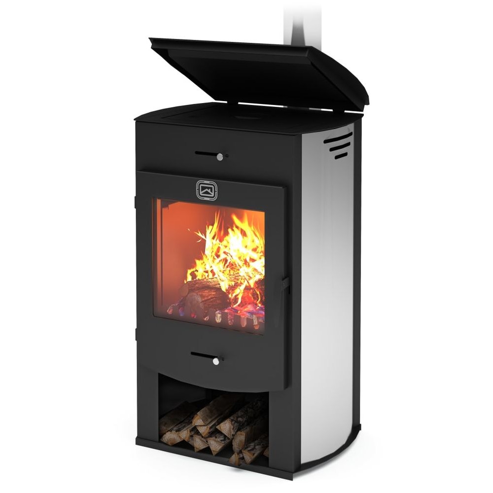 Компактный камин "Танго ПЛЮС" с варочной плитой обеспечивает прекрасный обзор огня (диагональ жаростойкого стекла 500 мм) и отапливает помещения до 80 м3.