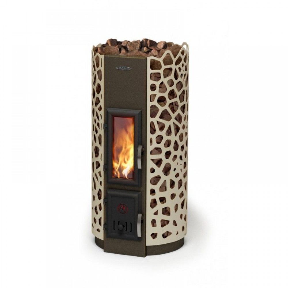 В сетчатый кожух печи помещается до 140 кг камней, в кожух дымохода – до 80 кг.