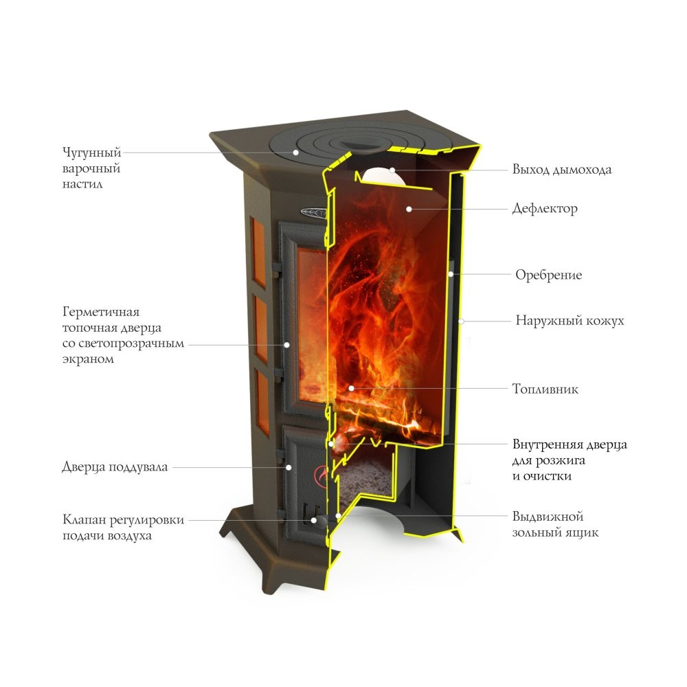 Внутренние панели, закрывающие ребра, обеспечивают дополнительное экранирование помещения от жесткого инфракрасного излучения. Снаружи топливник печи охвачен наружным кожухом. Конвекционные отверстия на боковых и задней стенках, отверстие в нижней части задней стенки и отверстие в центре основания печи обеспечивают свободную циркуляцию воздуха. За нижней чугунной дверцей располагается внутренняя дверца для розжига или очистки от золы.