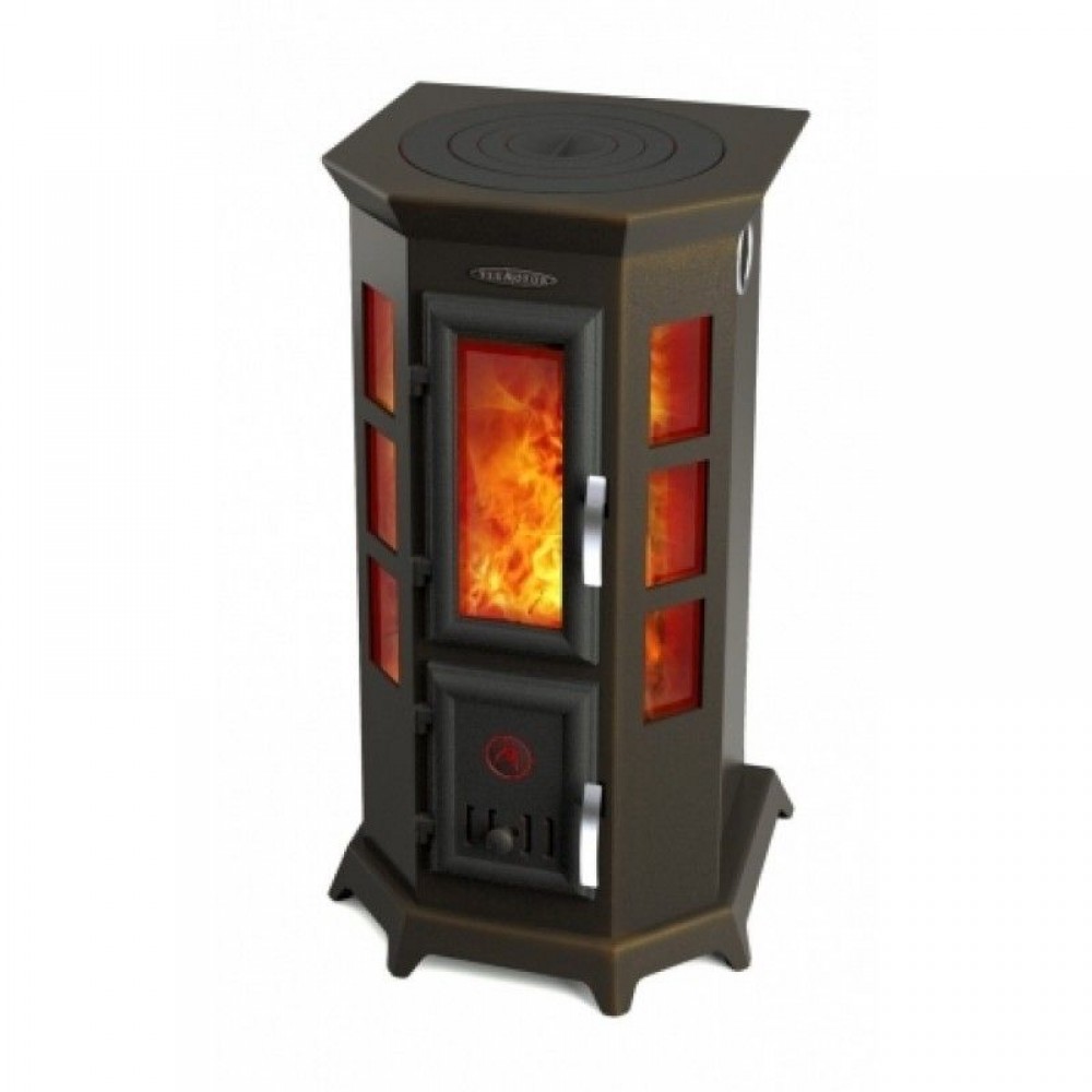 «Сексту» отличает более сложная архитектура фасада и большая площадь остекления топливника. Дополнительно к остеклению дверцы у этой печи имеется большой остекленный эркер, набранный из отдельных стекол, позволяющих наблюдать за огнем с разных углов зрения.