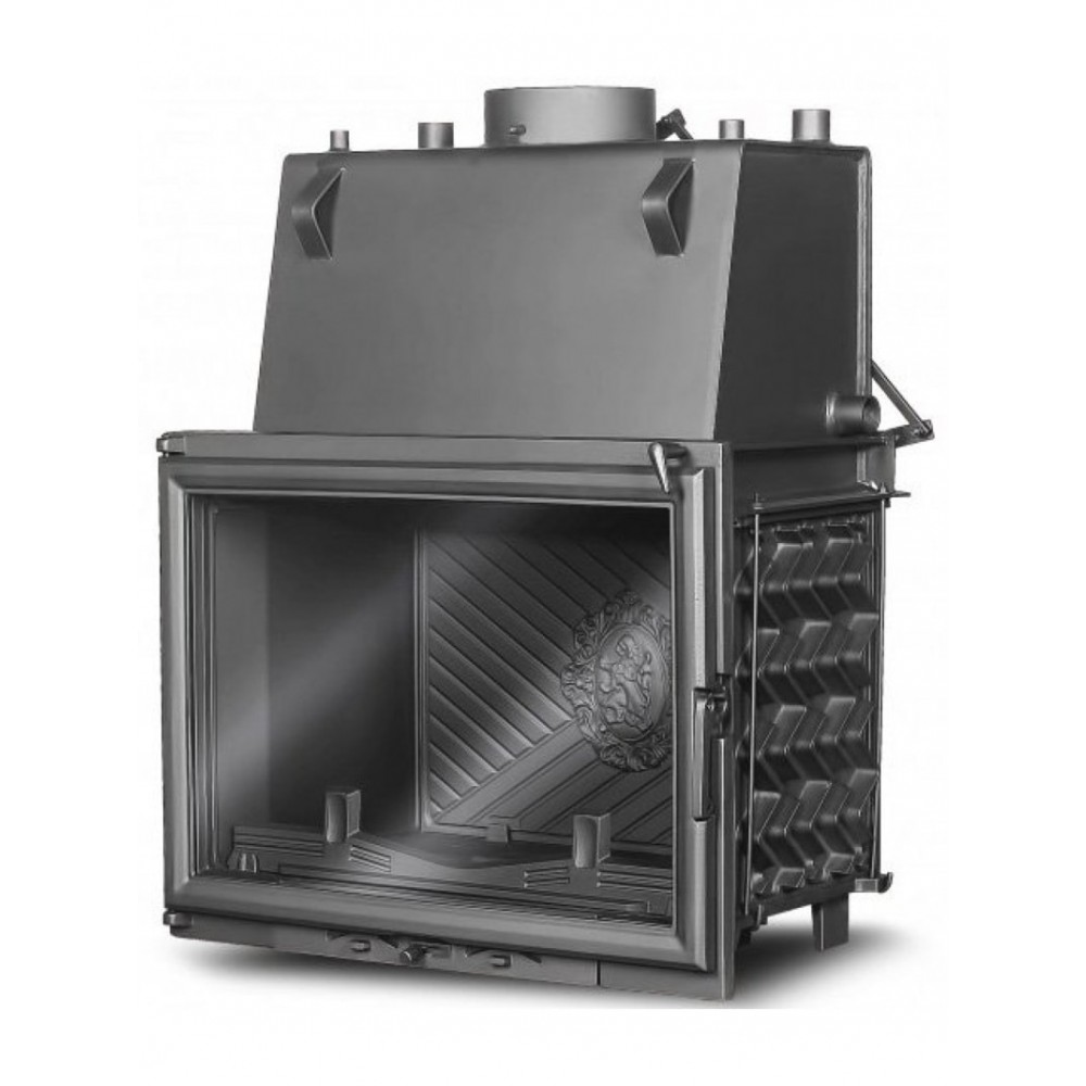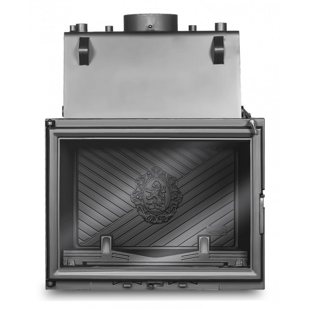 Каминная топка с водяной рубашкой W11CO (18 кВт) представляет собой топку W11 мощностью в режиме конвекции 10,1 кВт с установленным в верхней части топки водонаполненным теплообменником мощностью 7,9 кВт, такие отличные характеристики позволяют отапливать частный дом или административное здание площадью до 180 м.кв., а учитывая великолепную цену топки и топлива получить не только качественный дизайнерский отопительный прибор, а также красивый предмет интерьера с живым огнём. Жаростойкая плита в задней части топки декорирована гербом со львом.