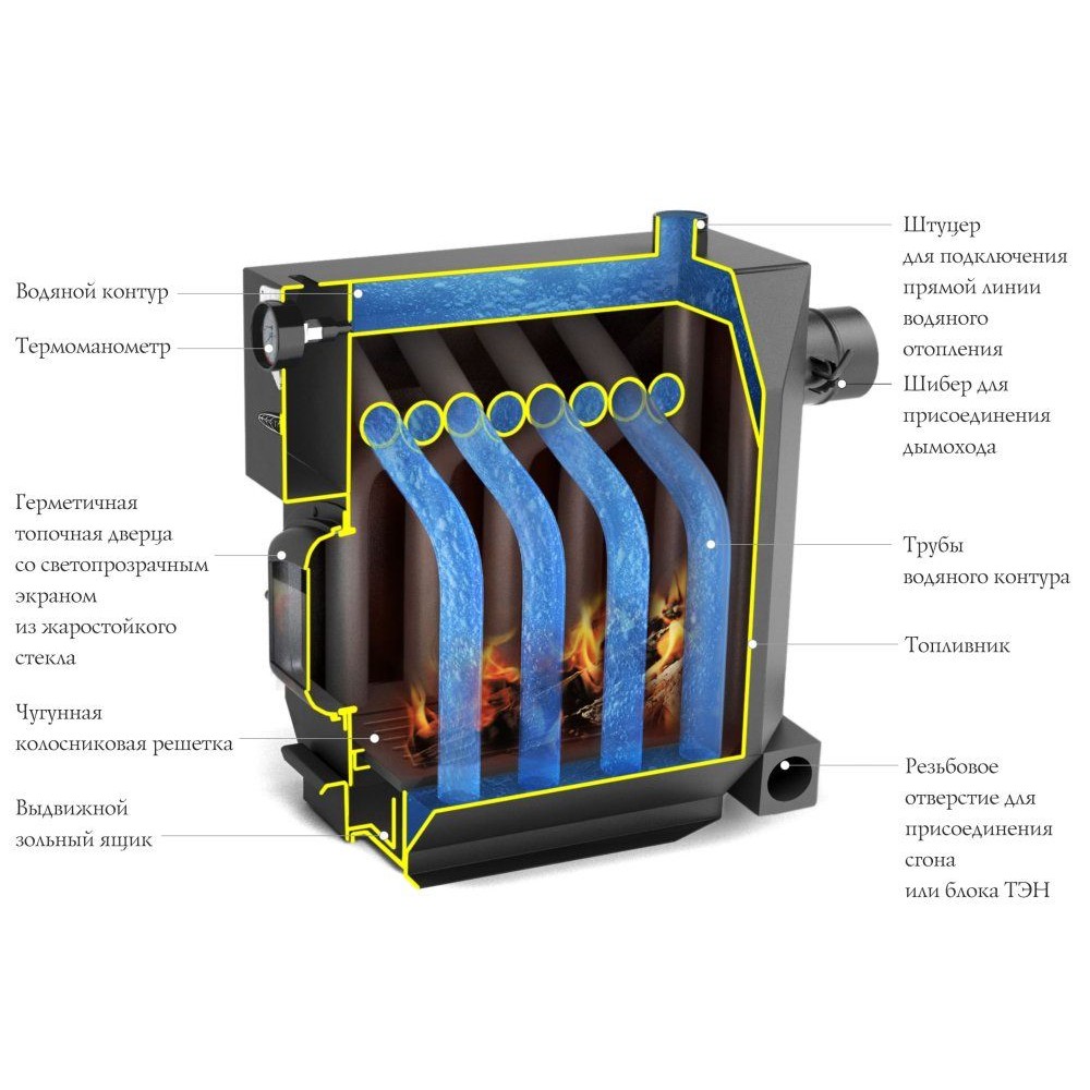 - Разработан на базе популярного воздухогрейного котла, с тем отличием, что в конвективных трубах теперь нагревается не воздух, а вода.