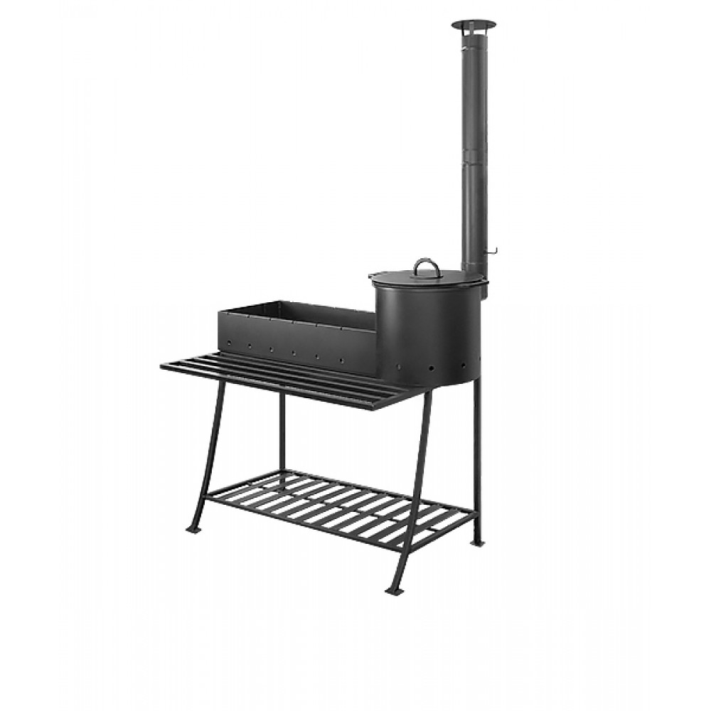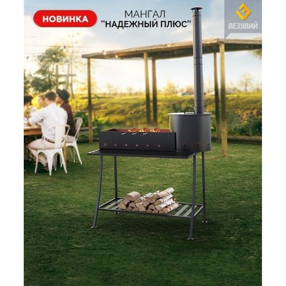 Мангал "Надежный плюс" получил свое название из-за того, что произведен из 6 мм котловой стали, покрытый термостойкой кремнийорганической эмалью, также особенностью мангала является печь под казан с высокой вытяжной трубой самоварного типа. На мангале можно одновременно готовить пищу на шампурах и в казане. Так как мангал стационарный для защиты от осадков в комплекте поставляется крышка для мангальной вставки и печи под казан.