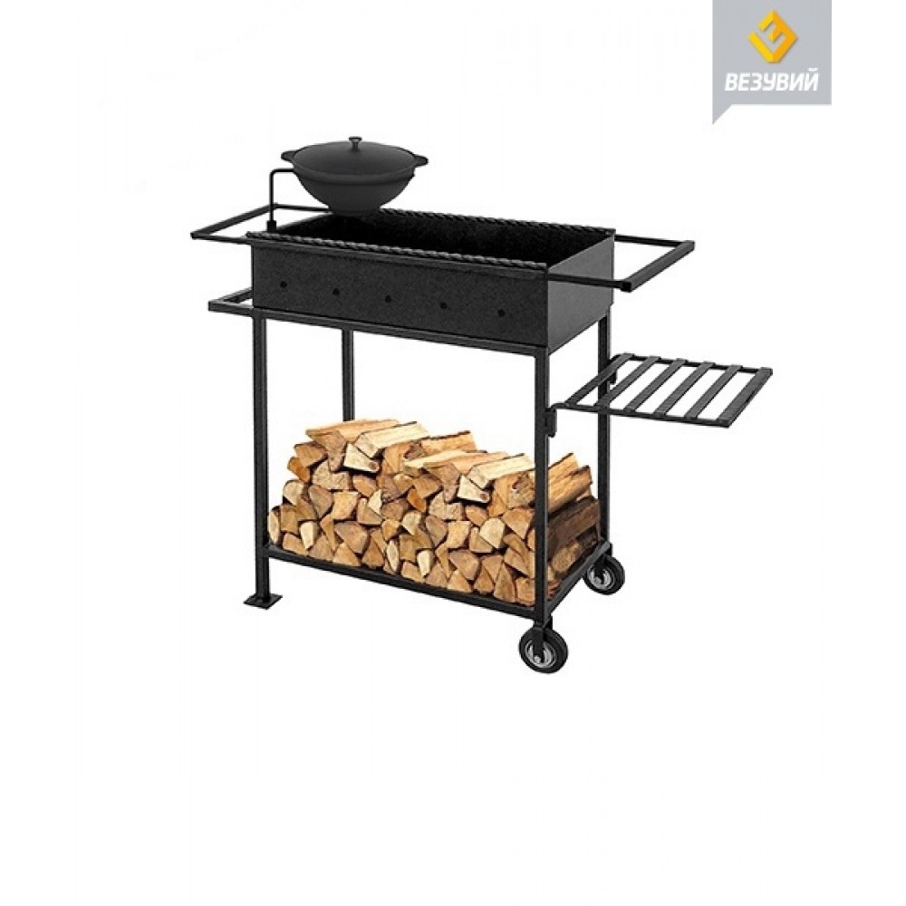 Крепкий и вместительный мангал с дровницей и подвесным столиком, и это еще все! В комплекте с грилем идет держатель для казана – крайней полезный аксессуар, а передняя пара ножек имеет колеса, перемещайте мангал по своему двору без особых улилий.